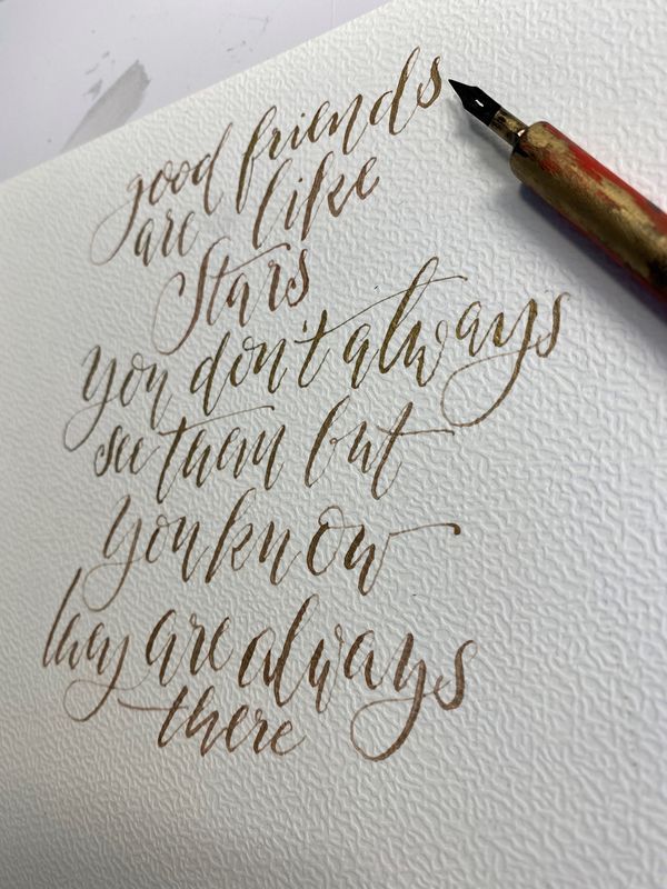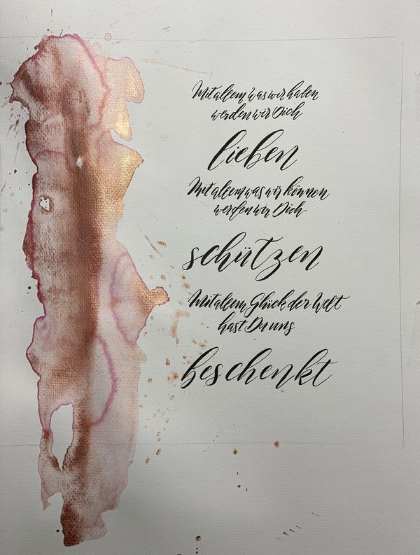 In diesem Kurs werden wir zunächst mit einem speziellen Pinselstift die Grundformen einer verspielten und eleganten Schrift erlernen, die den Eindruck einer mit Feder und Tusche kalligrafierten Schrift erweckt. Auf dieser Basis wird der künstlerische Umgang geübt und weiterentwickelt. Im Weiteren werden wir ein paar Hintergründe kreieren und Bildelemente nach Belieben mit Filzmarkern und oder Aquarellfarben ergänzen.